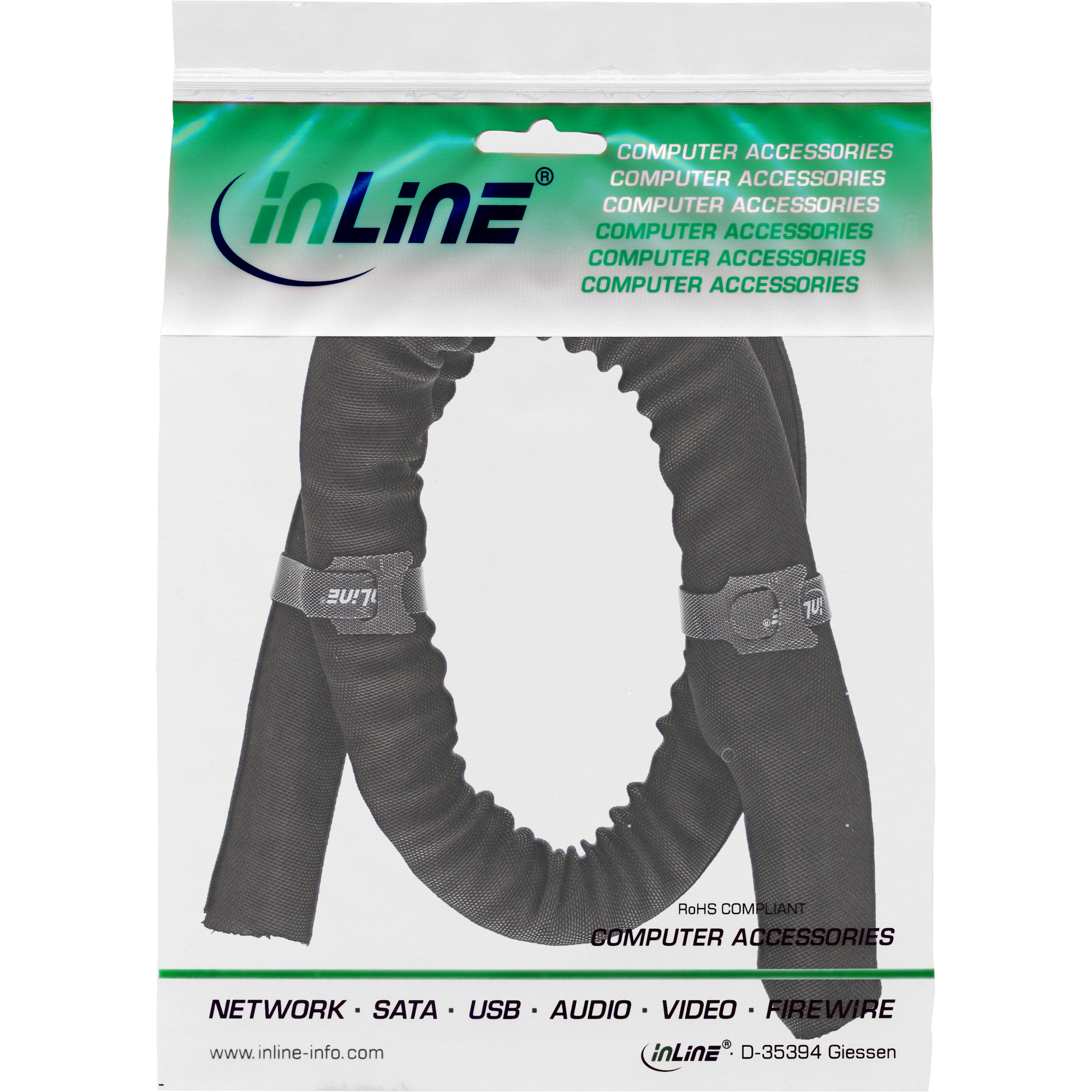 Der InLine® Geflechtschlauch (1 m, Ø 25 mm, schwarz) bietet eine robuste und flexible Möglichkeit, Kabelbündel sicher zu organisieren und zu schützen. Dank der Kombination aus Polypropylen-Mantel außen und Polyestergewebe innen ist er leicht, abriebfest und schwer entflammbar.