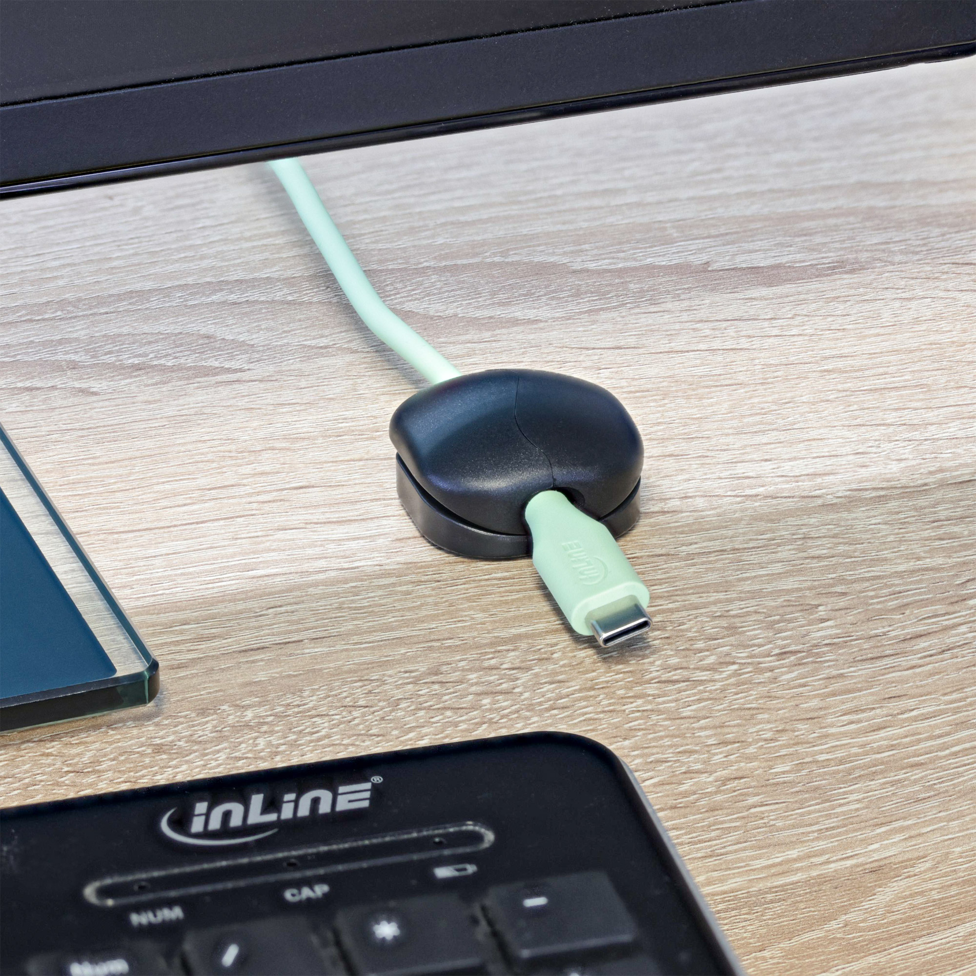 Mit dem InLine® Click Kabelmanager 1-Line lassen sich Kabel sauber, sicher und ohne Aufwand organisieren. Durch das praktische Click-System wird das Kabel einfach eingelegt und der Clip anschließend verschlossen – ideal für bereits angeschlossene Leitungen oder nachträgliche Anpassungen. Die Befestigung erfolgt werkzeuglos über ein stark haftendes 3M® Klebepad, das zuverlässig auf glatten, gereinigten Oberflächen hält.