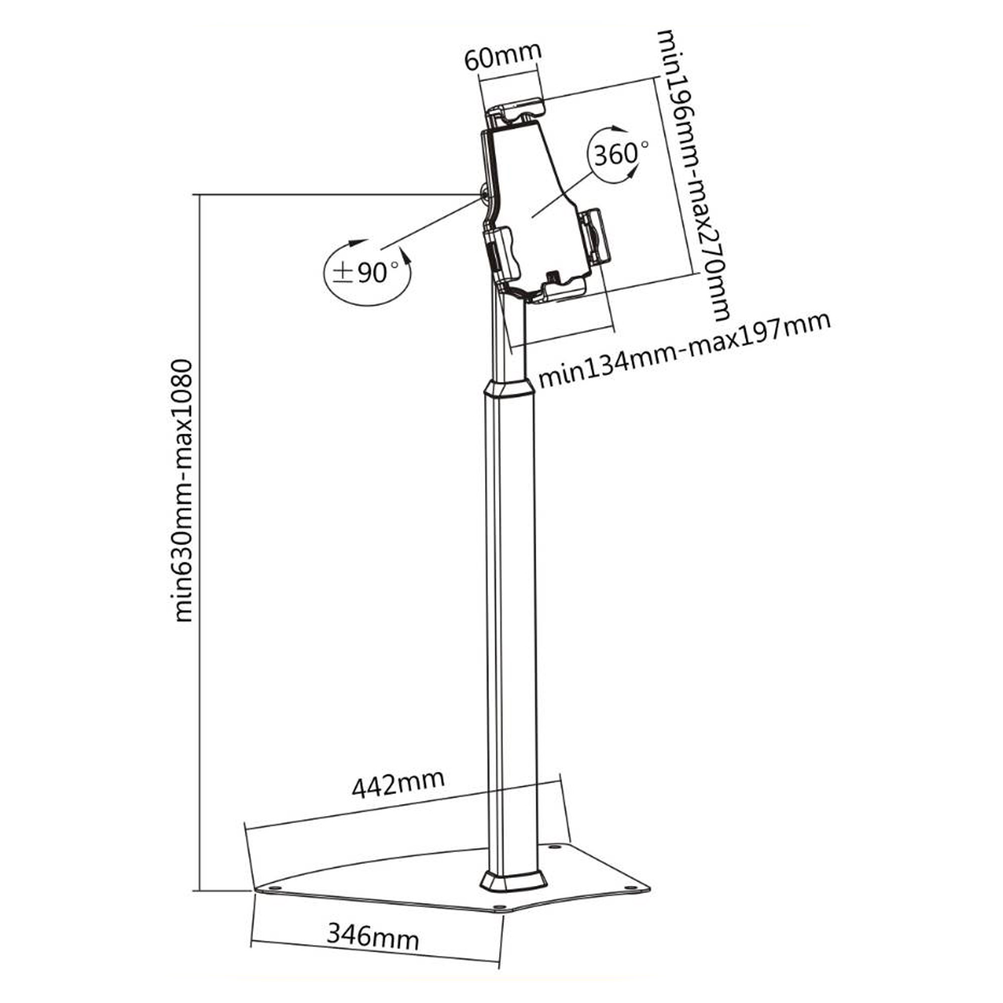 Dank der höhenverstellbaren Säule (63–108 cm) und der 360° drehbaren sowie +/- 90° neigbaren Aufnahme lässt sich das Tablet flexibel ausrichten – ob im Hoch- oder Querformat. Eine integrierte Kabelführung sorgt für Ordnung und verhindert Kabelsalat am Point of Sale.
