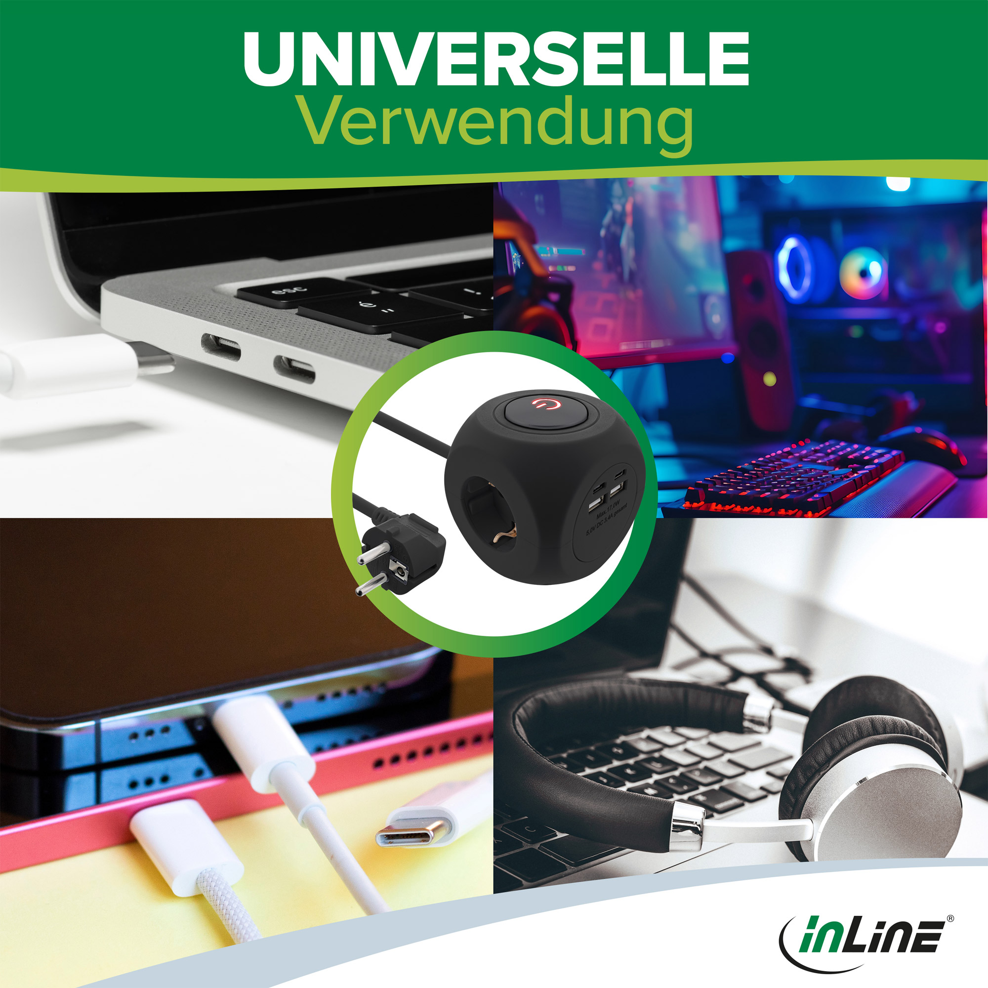InLine® Charging Cube, 3x Schutzkontakt, 2x USB-C, 2x USB-A, schwarz, 2m