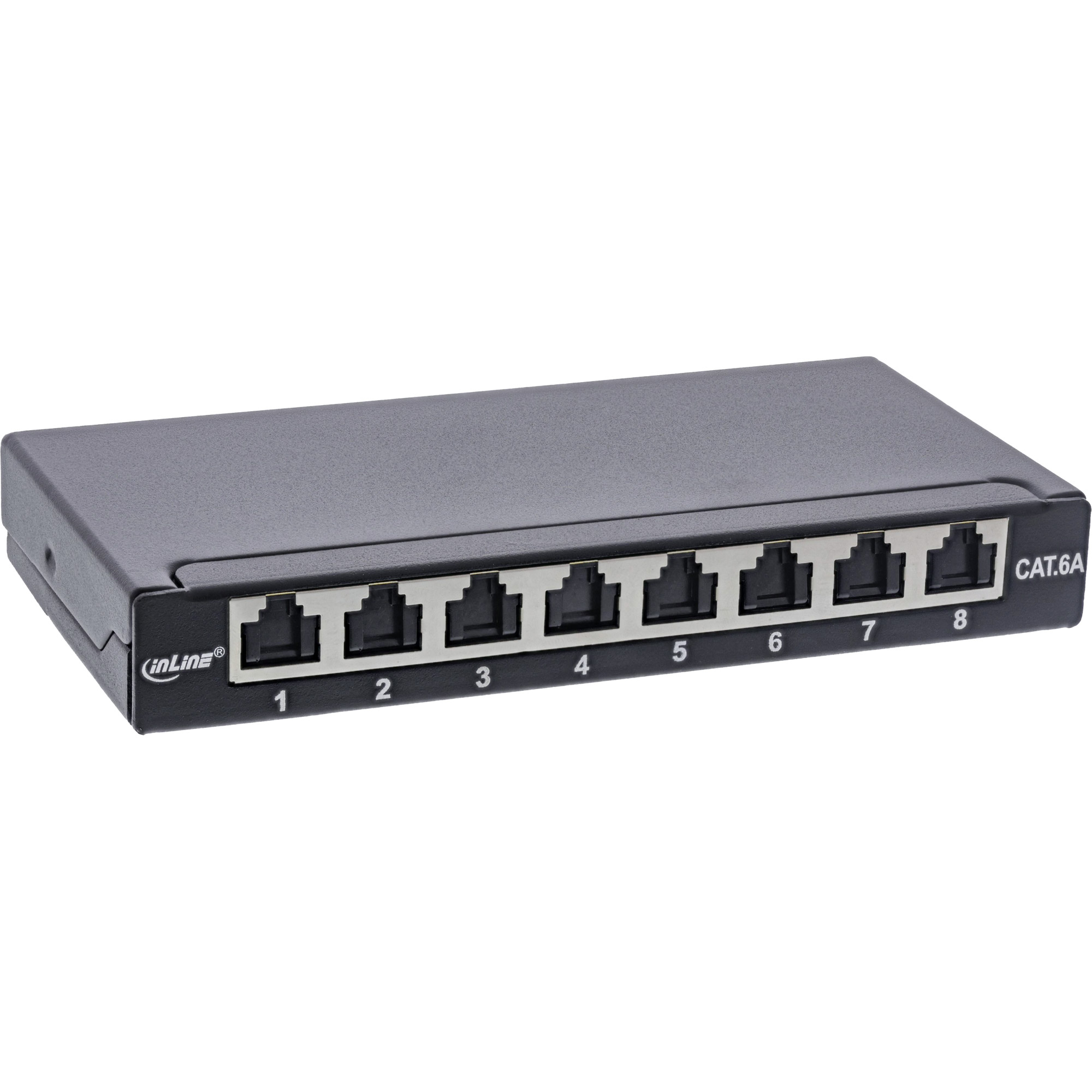 Patchpanel Cat.6A – 8-fach, 0,5HE, Tisch/Wand/Hutschiene, schwarz, mit Staubschutz