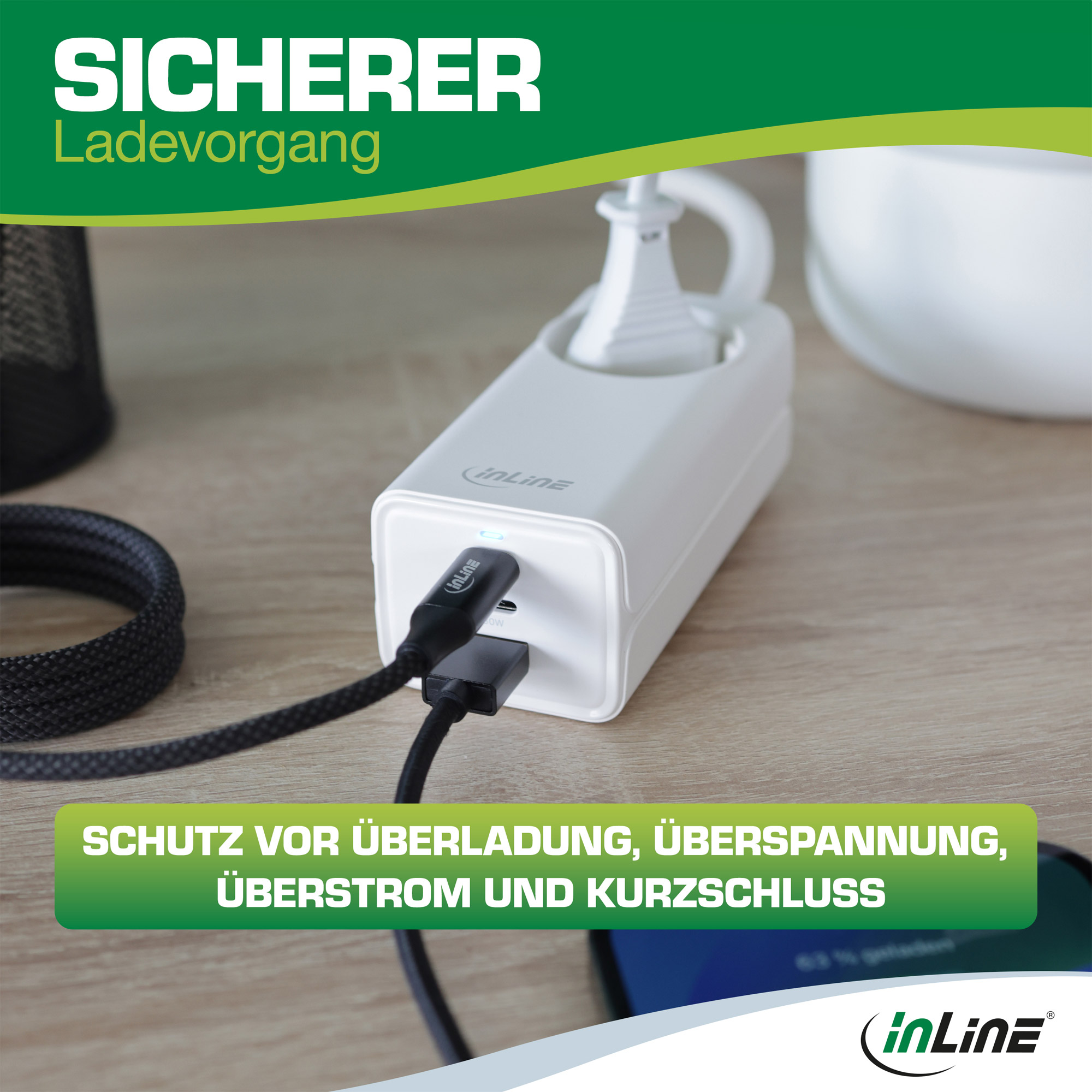 - Temperaturschutz: Bei zu hoher Temperatur des Netzteils schaltet es automatisch ab und setzt nach Abkühlung das Laden automatisch fort