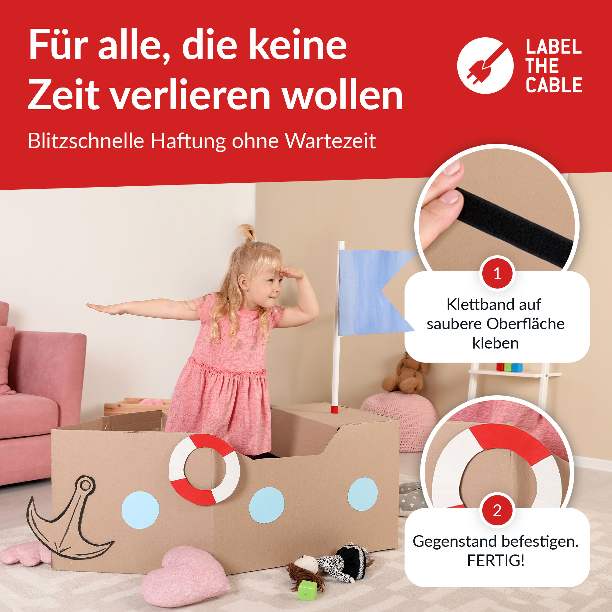 Das LABEL THE CABLE EASY TAPE STRAP ist das ultimative selbstklebende Klettband für schnelle, zuverlässige Befestigungen im Innenbereich! Mit diesem selbstklebenden Klettband (20 mm breit, 8 m lang) können Sie Bilder, Polster und andere Gegenstände sicher und schnell fixieren - ohne zu bohren oder Nägel einzuschlagen. Das ganze ohne Wartezeit, da EASY TAPE direkt nach dem Anbringen belastet werden kann. Auch lassen sich individuelle kleine Klettklebepunkte ausschneiden, so dass sie sich für jeden Bedarf individuell anpassen lassen. So stellt das LABEL THE CABLE EASY TAPE auch eine ideale wiederverwendbare Alternative für doppelseitiges Klebeband dar.