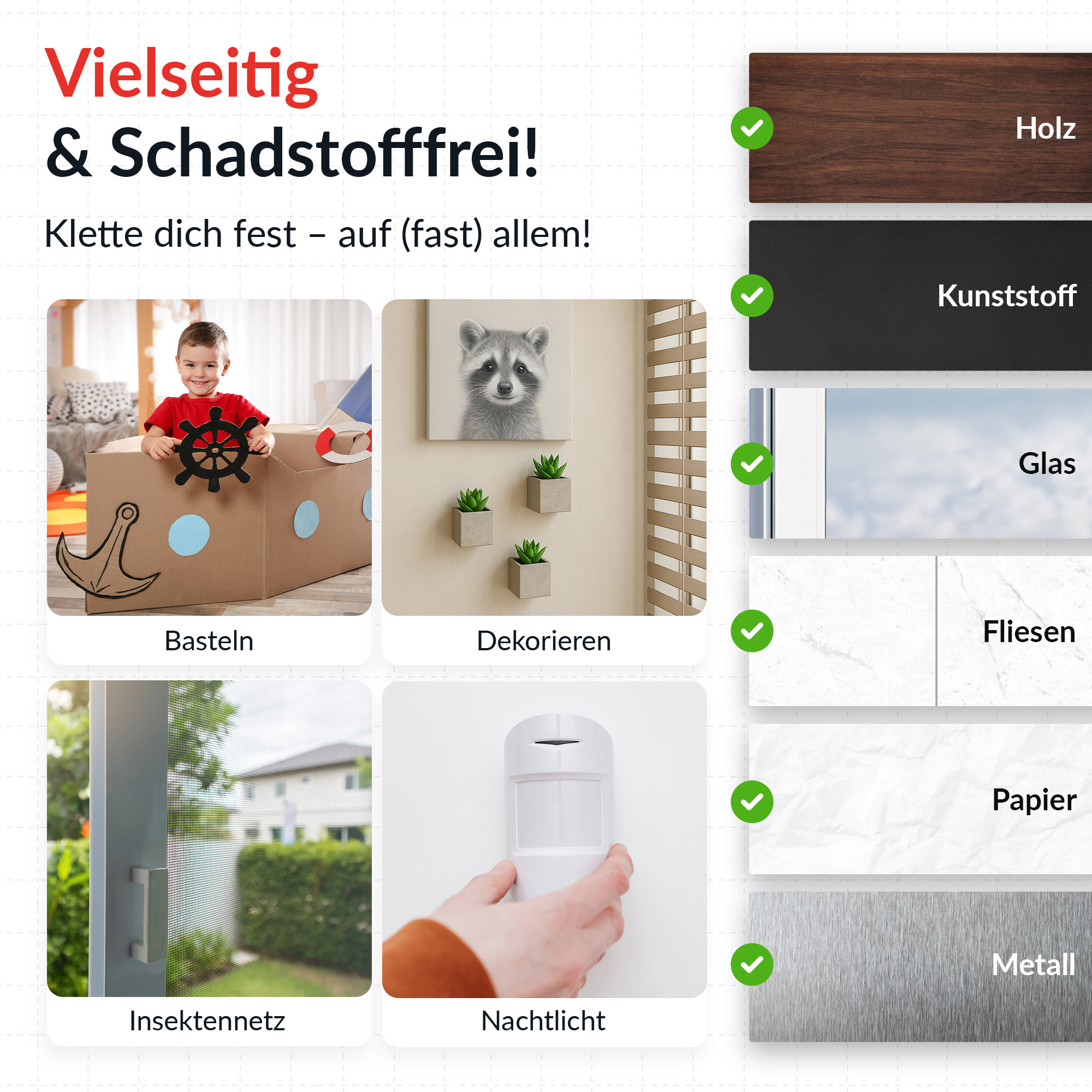 RÜCKSTANDSLOS ENTFERNBAR: Vielseitige Alternative zu herkömmlichem doppelseitigen Klebeband - lässt sich bei Bedarf ablösen ohne Klebereste an Wänden und Oberflächen zuhinterlassen. Vorsicht bei Tapeten und porösen Oberflächen!