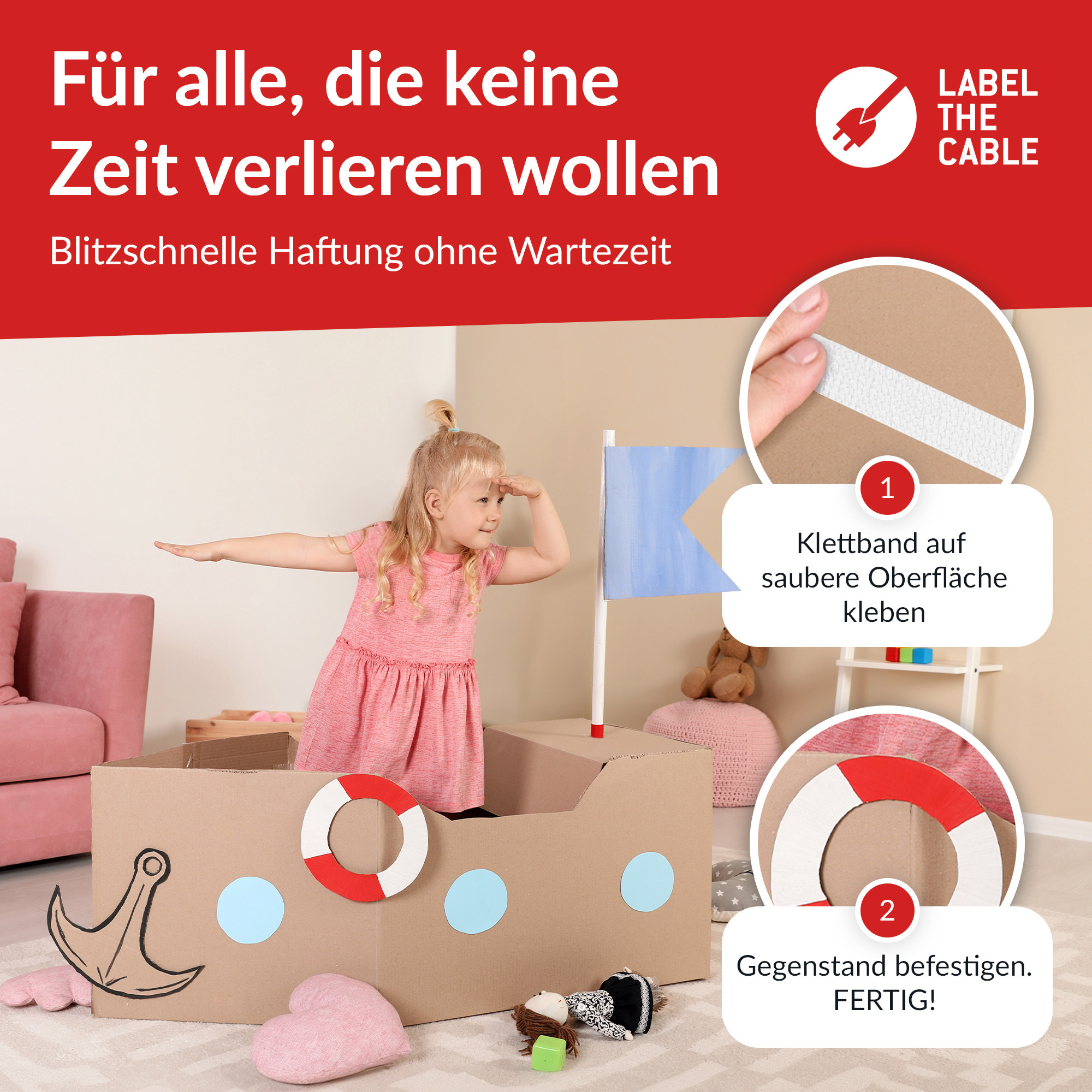 Das LABEL THE CABLE EASY TAPE STRAP ist das ultimative selbstklebende Klettband für schnelle, zuverlässige Befestigungen im Innenbereich! Mit diesem selbstklebenden Klettband (20 mm breit, 8 m lang) können Sie Bilder, Polster und andere Gegenstände sicher und schnell fixieren - ohne zu bohren oder Nägel einzuschlagen. Das ganze ohne Wartezeit, da EASY TAPE direkt nach dem Anbringen belastet werden kann. Auch lassen sich individuelle kleine Klettklebepunkte ausschneiden, so dass sie sich für jeden Bedarf individuell anpassen lassen. So stellt das LABEL THE CABLE EASY TAPE auch eine ideale wiederverwendbare Alternative für doppelseitiges Klebeband dar.