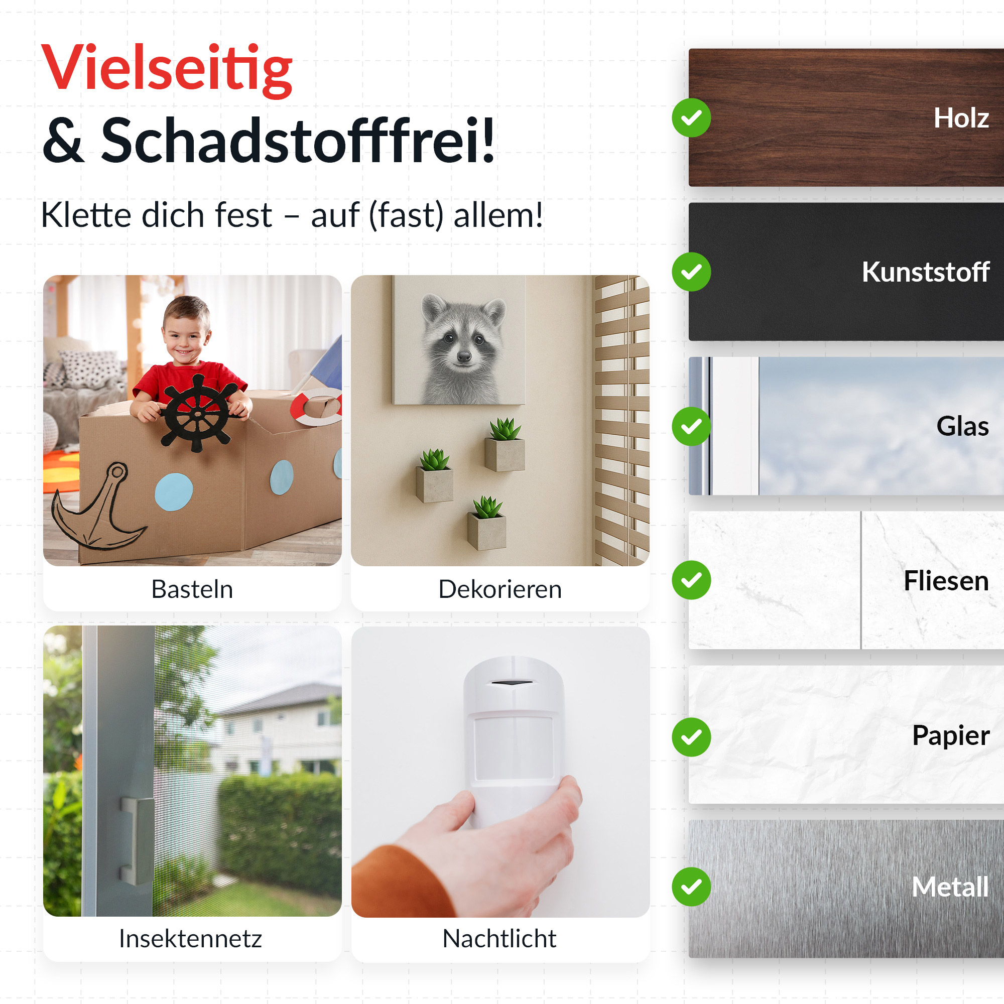 RÜCKSTANDSLOS ENTFERNBAR: Vielseitige Alternative zu herkömmlichem doppelseitigen Klebeband - lässt sich bei Bedarf ablösen ohne Klebereste an Wänden und Oberflächen zuhinterlassen. Vorsicht bei Tapeten und porösen Oberflächen!