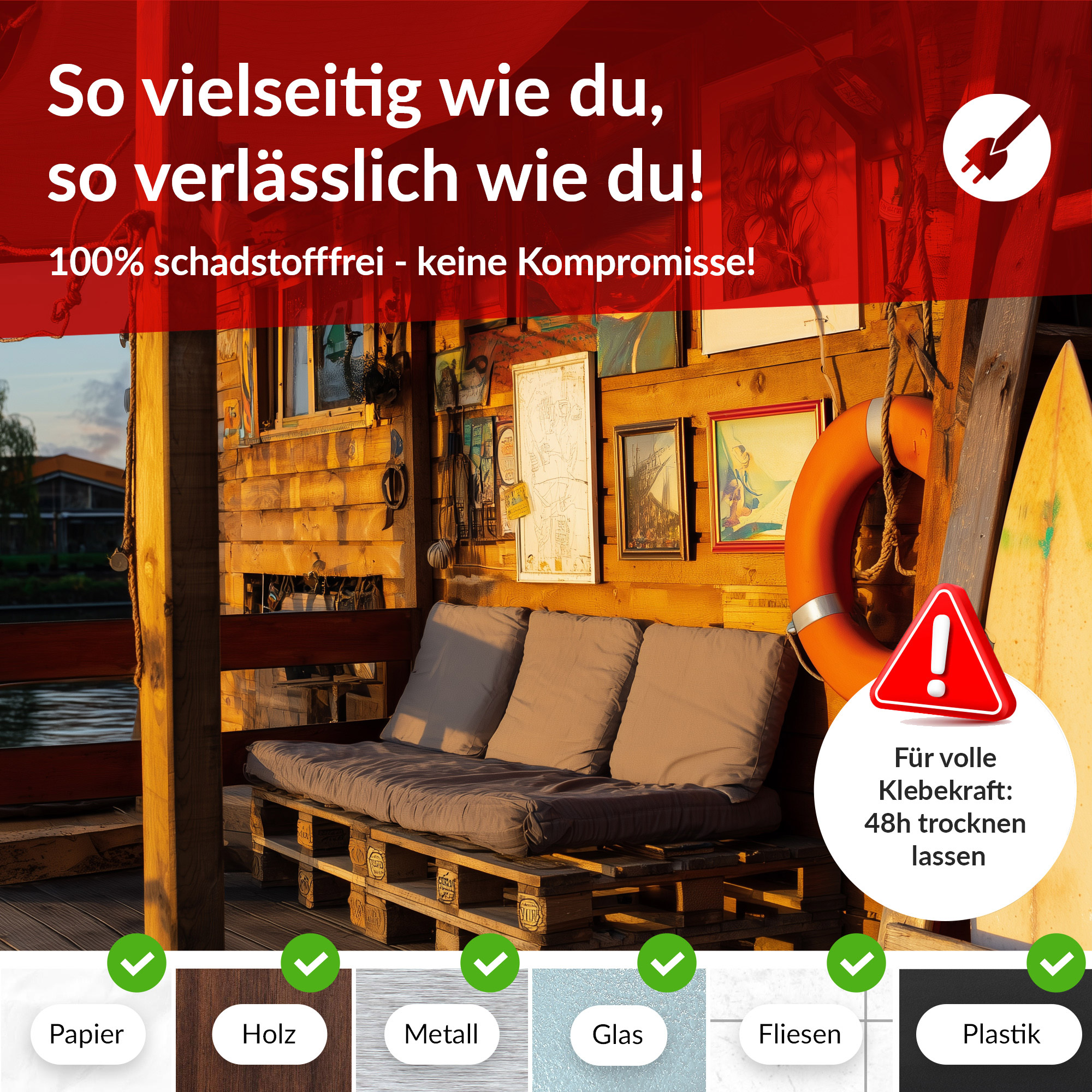 WASSERFEST & WETTERFEST: Speziell auch für den Außenbereich entwickelt - hält es zuverlässig auch auf feuchten, kalten Oberflächen, bei Hitze und extremen Wetterbedingungen. Ideal auch für Boote und andere Wassersportgeräte, wie z.B. Kajaks.