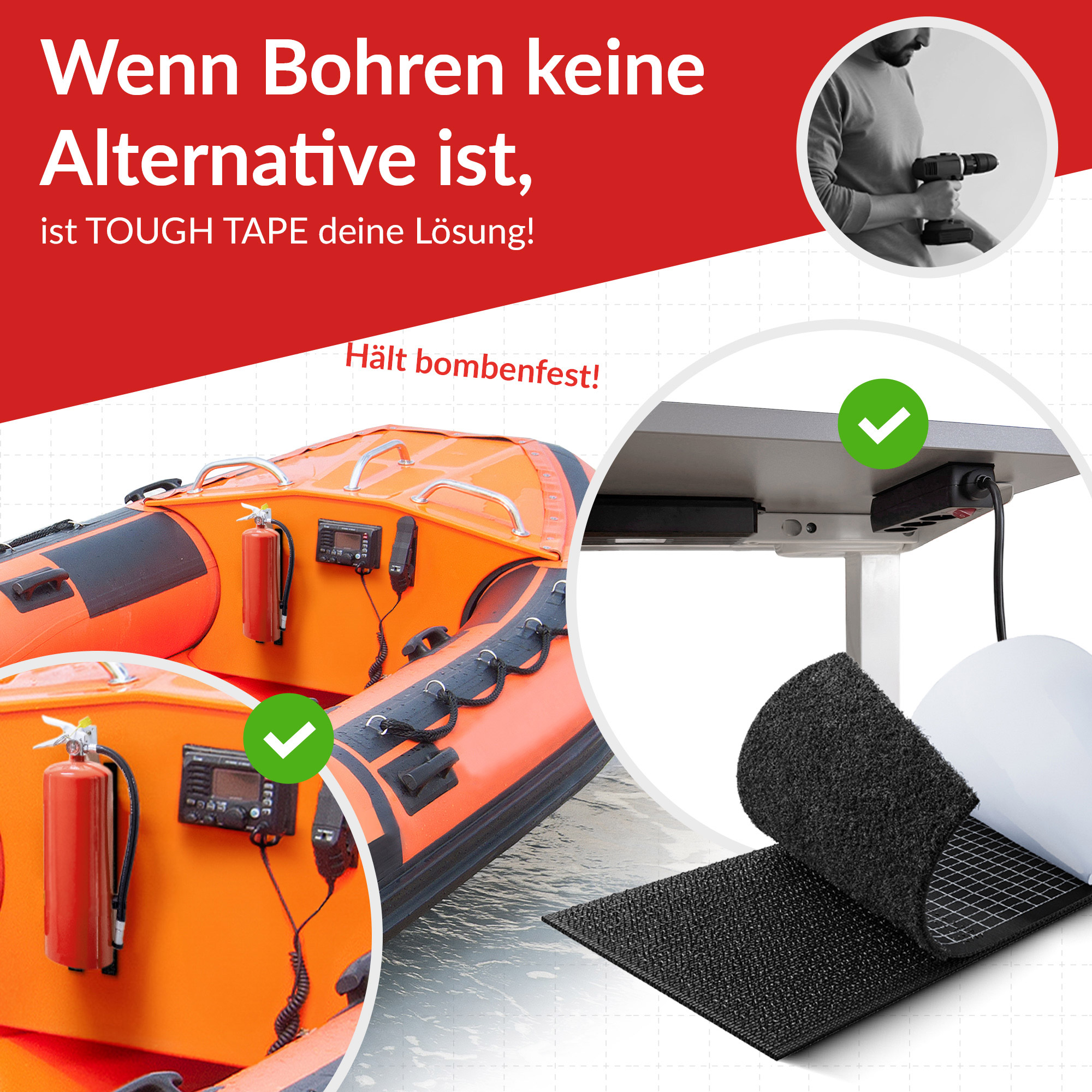 VIELSEITIG EINSETZBAR: Ideal für Outdoor-Möbel, Gartendekoration, Camping-Ausrüstung, DIY-Projekte und Wohnmobilausstattung. Aber auch im Innenbereich, wenn extreme Befestigungslösungen ohne Bohren benötigt werden. Nach Extra stark kommt TOUGH TAPE.