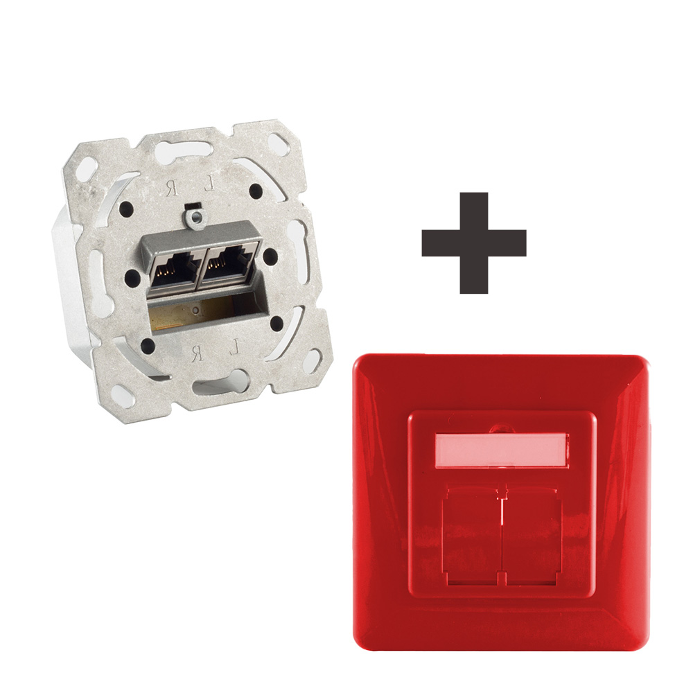 Netzwerkdose Cat.6A Unterputz 2-fach, vollgeschirmt, LSA, horizontale Kabelführung, inkl. Zentralstück & Abdeckrahmen, Rot